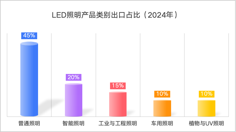 过去中国出口的LED照明产品以球泡灯、灯管等普通照明为主,2024年这类产品依旧占比约45%。但值得注意的是,智能照明、车用照明与植物照明等新兴产品,正在成为出口新亮点。例如: